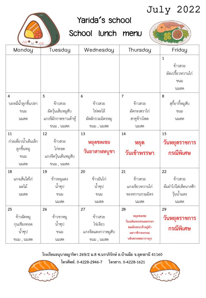 เมนูอาหาร เดือน กรกฏาคม 2565