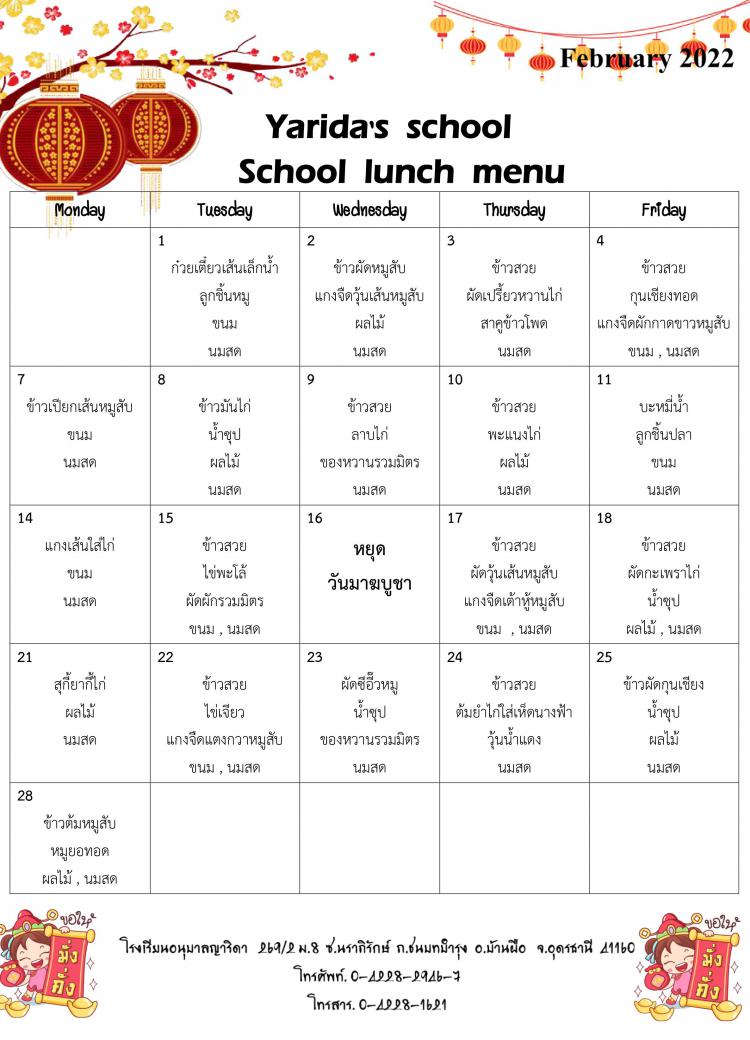 เมนูอาหาร เดือน กุมภาพันธ์ 2565
