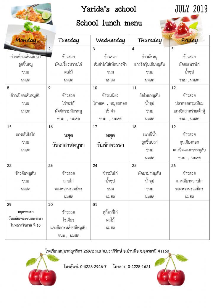 เมนูอาหาร เดือนกรกฏาคม 2562