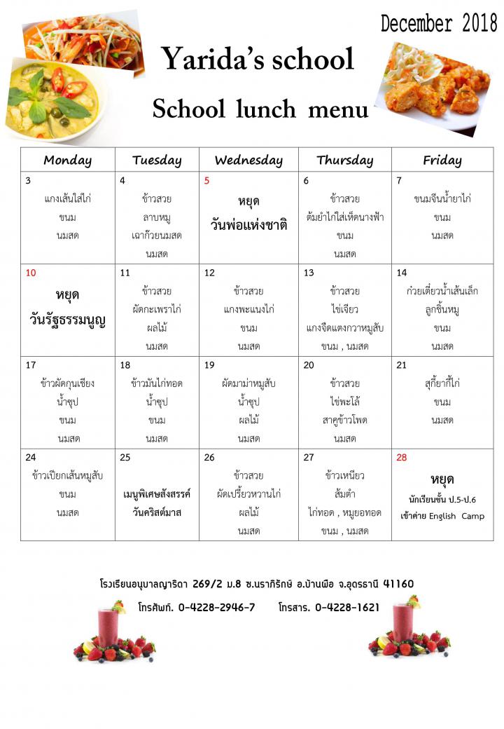 เมนูอาหาร เดือนธันวาคม 2561