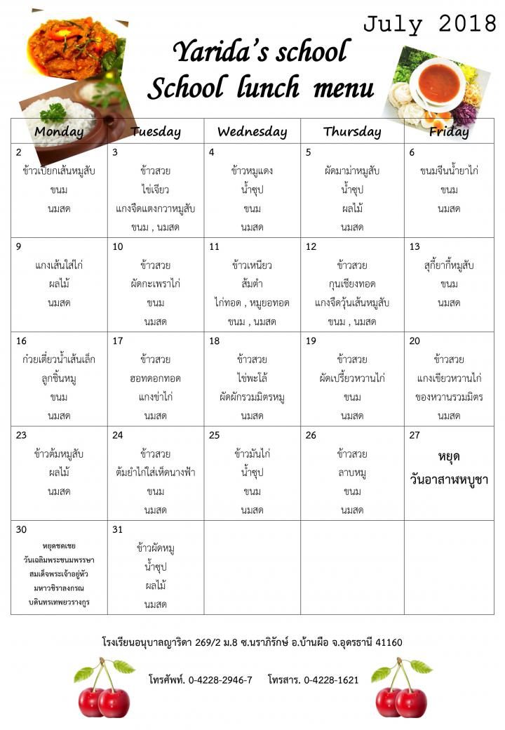 เมนูอาหาร เดือนกรกฏาคม 2561