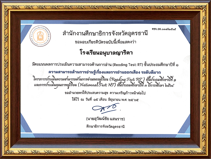 เกียรติบัตรผลการประเมินความสามารถด้านการอ่าน (Reading Test: RT) ชั้นประถมศึกษาบีที่ 1 ปีการศึกษา 2564