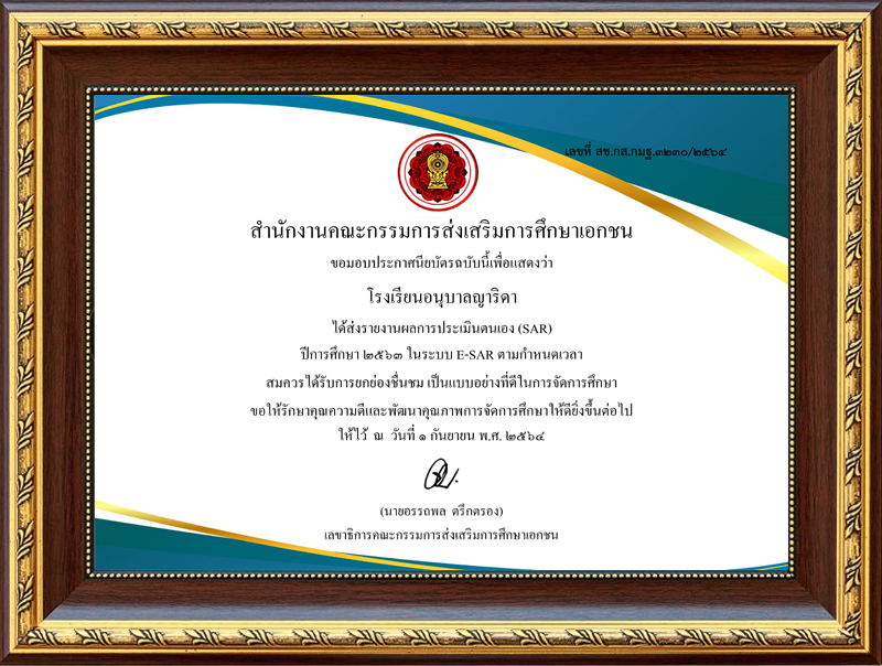 เกียรติบัตรส่งรายงานผลการประเมินตนเอง (SAR) ปีการศึกษา 2563