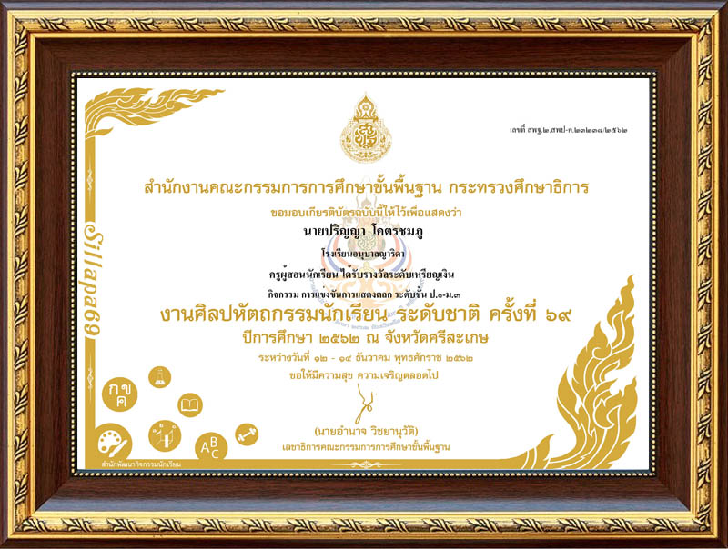 นายปริญญา โคตรชมภู รางวัล : ครูผู้ฝึกสอนนักเรียน ได้รับรางวัลระดับเหรียญเงิน กิจกรรม : การแข่งขันการแสดงตลก ระดับชั้น ป.๑-ม.๓ ในงานศิลปหัตถกรรมนักเรียน ระดับชาติ ครั้งที่ ๖๙ ปีการศึกษา ๒๕๖๒ วันที่ ๑๒-๑๔ ธันวาคม ๒๕๖๒ ณ จังหวัดศรีสะเกษ |