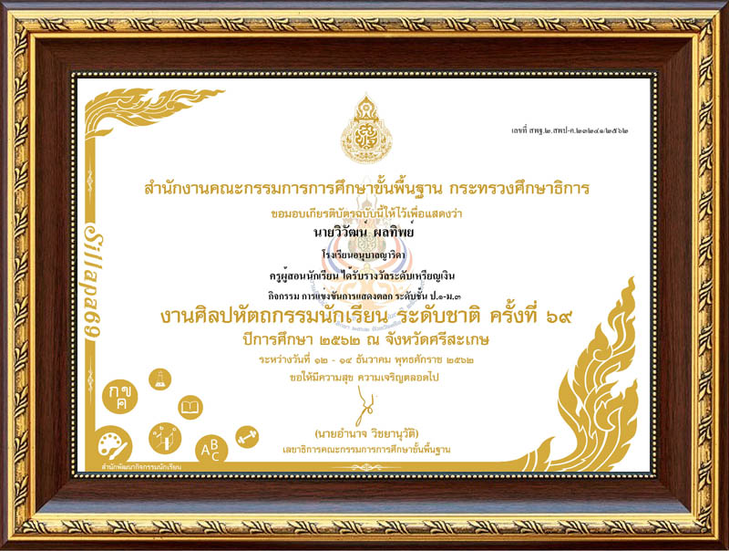 นายวิวัฒน์ ผลทิพย์ รางวัล : ครูผู้ฝึกสอนนักเรียน ได้รางวัลระดับเหรียญเงิน กิจกรรม : การแข่งขันการแสดงตลก ระดับชั้น ป.๑-ม.๓ ในงานศิลปหัตถกรรมนักเรียน ระดับชาติ ครั้งที่ ๖๙ ปีการศึกษา ๒๕๖๒ วันที่ ๑๒-๑๔ ธันวาคม ๒๕๖๒ ณ จังหวัดศรีสะเกษ |