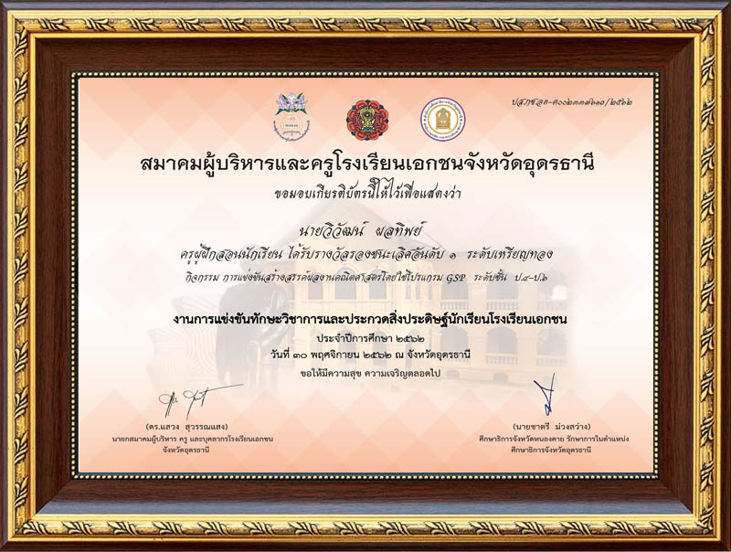 ชื่อผลงาน : ครูผู้ฝึกสอนนักเรียน ได้รับรางวัลรองชนะเลิศอันดับ ๑ ระดับเหรียญทอง