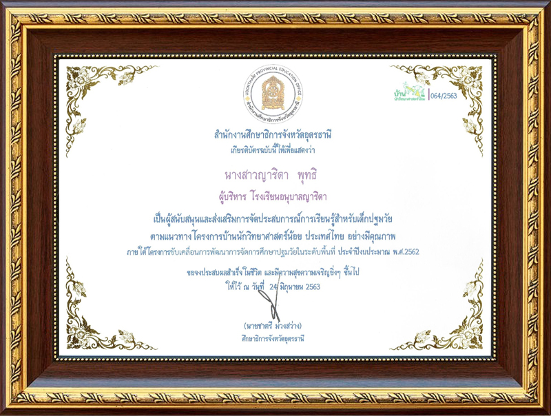 ชื่อผลงาน : เป็นผู้สนับสนุนและส่งเสริมการจัดประสบการณ์การเรียนรู้สำหรับเด็กปฐมวัย ตามแนวทางโครงการบ้านนักวิทยาศาสตร์น้อย ผู้รับรางวัล : นางสาวญาริดา พุทธิ ตำแหน่ง : ผู้บริหารโรงเรียนอนุบาลญาริดา หน่วยงานที่รับผิดชอบ : ศึกษาธิการจังหวัดอุดรธานี ปีการศึกษาที่ได้รับ : ๒๕๖๓ |