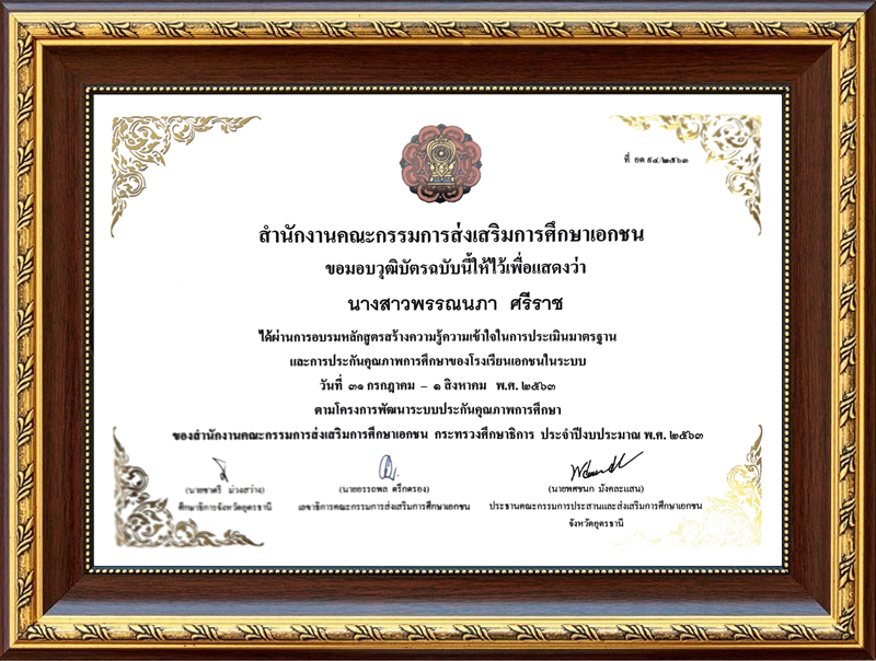 ชื่อผลงาน : ผ่านการอบรมหลักสูตรสร้างความรู้ความเข้าใจในการประเมินมาตรฐานและการประกันคุณภาพการศึกษาของโรงเรียนเอกชน