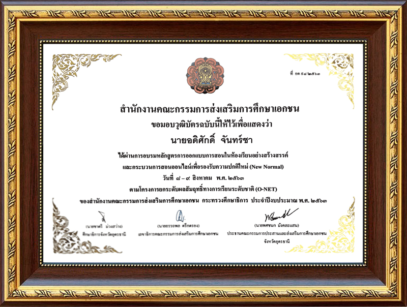 ชื่อผลงาน : ได้ผ่านการอบรมหลักสูตรการออกแบบการสอนในห้องเรียนอย่างสร้างสรรค์ และกระบวนการสอนออนไลน์เพื่อรับรองความปกติใหม่ (New Normal) ผู้รับรางวัล : นายอดิศักดิ์ จันทร์ชา ตำแหน่ง : ครูประจำชั้น หน่วยงานที่รับผิดชอบ : ศึกษาธิการจังหวัดอุดรธานี ปีการศึกษาที่ได้รับ : ๒๕๖๓ |