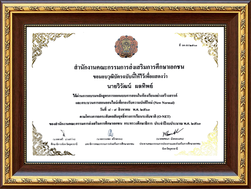 ชื่อผลงาน : ได้ผ่านการอบรมหลักสูตรการออกแบบการสอนในห้องเรียนอย่างสร้างสรรค์ และกระบวนการสอนออนไลน์เพื่อรับรองความปกติใหม่ (New Normal) ผู้รับรางวัล : นายวิวัฒน์ ผลทิพย์ ตำแหน่ง : ครูประจำชั้น หน่วยงานที่รับผิดชอบ : ศึกษาธิการจังหวัดอุดรธานี ปีการศึกษาที่ได้รับ : ๒๕๖๓ |