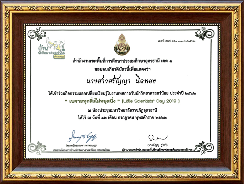 ชื่อผลงาน : ได้เข้าร่วมกิจกรรมแลกเปลี่ยนเรียนรู้ในงานเทศกาลวันนักวิทยาศาสตร์น้อย "เพราะทุกสิ่งไม่หยุดนิ่ง" (Little Scientists' Day 2019) ผู้รับรางวัล : นางสาวศรัญญา นิลทอง ตำแหน่ง : ครูประจำชั้น หน่วยงานที่รับผิดชอบ : ศึกษาธิการจังหวัดอุดรธานี ปีการศึกษาที่ได้รับ : ๒๕๖๒ |