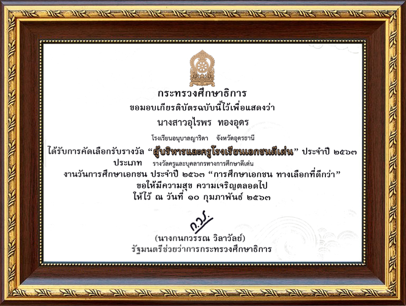 ชื่อผลงาน : ได้รับรางวัล "ผู้บริหารและครูโรงเรียนเอกชนดีเด่น" ประจำปี 2563 ประเภท รางวันครูและบุคลากรทางการศึกษาดีเด่น ผู้รับรางวัล : นางสาวอุไรพร ทองอุดร ตำแหน่ง : เจ้าหน้าที่การเงิน หน่วยงานที่รับผิดชอบ : กระทรวงศึกษาธิการ ปีการศึกษาที่ได้รับ : 2563 |