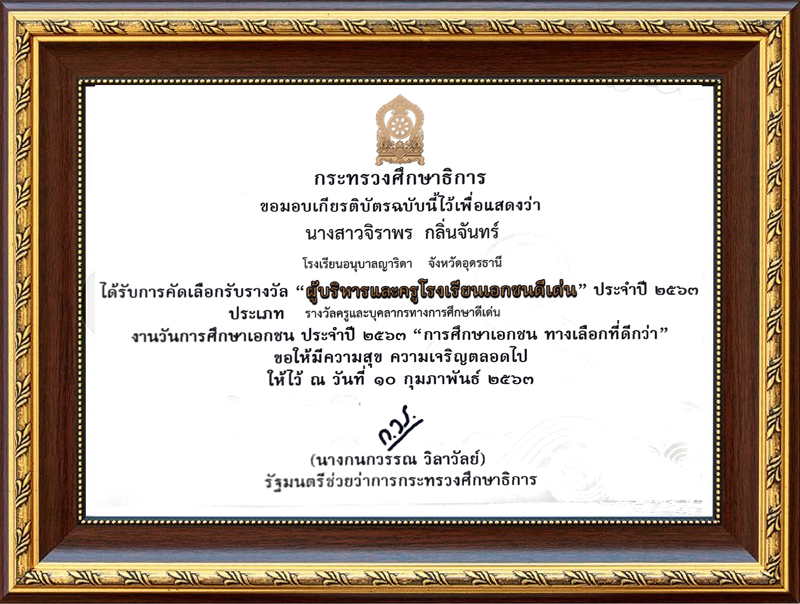 ชื่อผลงาน : ได้รับรางวัล "ผู้บริหารและครูโรงเรียนเอกชนดีเด่น" ประจำปี 2563