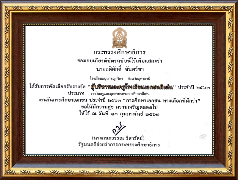 ชื่อผลงาน : ได้รับรางวัล "ผู้บริหารและครูโรงเรียนเอกชนดีเด่น" ประจำปี 2563 ประเภท รางวันครูและบุคลากรทางการศึกษาดีเด่น ผู้รับรางวัล : นายอดิศักดิ์ จันทร์ชา ตำแหน่ง : ครูผู้สอน หน่วยงานที่รับผิดชอบ : กระทรวงศึกษาธิการ ปีการศึกษาที่ได้รับ : 2563 |