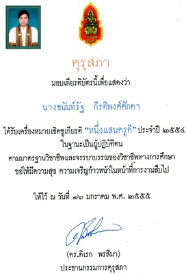 ชื่อผลงาน : รางวัลหนึ่งแสนครูดี ปี พ.ศ. ๒๕๕๔